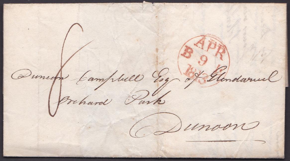 Being a stamp collector, I couldn't resist this 1813 stampless cover. Glendaruel is a cadet branch of the Campbell Clan Chief/ Duke of Argyle. Sent from John Campbell, advising Duncan not to be in a hurry to build a house for Black your ferryman. This Duncan Campbell of Glendaruel was the 4 great grandson of Archibald Campbell, Laird of Lochnell 1530-94. Sent to Dunoon over 300 years after our Duncan Campbell AKA Denune escaped justice; they could have been distant cousins. Our Duncan Campbell, AKA Denune's ancestry back to "his kinsman" the Earl of Argyle is unknown. If anyone can offer help it would be MUCH appreciated!